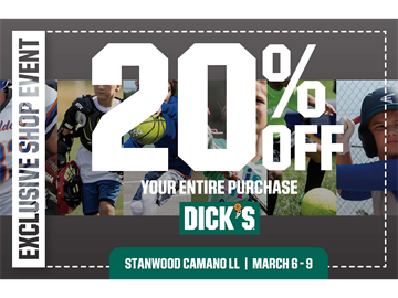 Our partner DICK’S Sporting Goods is offering all our members an exclusive discount of 20% off throughout the store! Be sure to grab all the things you will need for the upcoming season. The coupon is valid in-store only and must be shown at the register during checkout by clicking on the hyperlink.**Coupon link will be shared via email before the valid weekend dates.